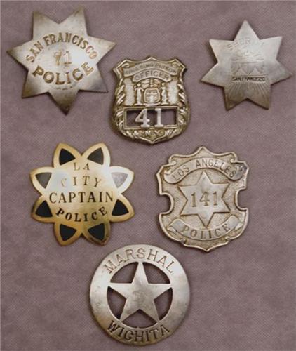 Badge Collection. Six police, prison, sheriff, and marshall badges. 2" to 2 ½” wide. (est $600-800). All items appear to be reproductions made by a company, no longer in business, that typically sold high quality reproductions in the range of $60-$100. Collectible in their own right and no longer available other than on the secondary market, these might be a good alternative to the real thing. No statements as to authenticity.