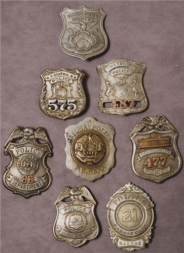 Badge Collection. Eight large badges. Police and railway police. Kansas City, Reno, D.C., Hartford, New York, Columbus and Detroit. (est $800-1,000). All items appear to be reproductions made by a company, no longer in business, that typically sold high quality reproductions in the range of $60-$100. Collectible in their own right and no longer available other than on the secondary market, these might be a good alternative to the real thing. No statements as to authenticity.