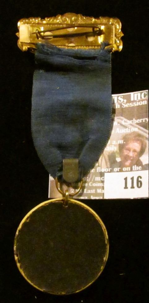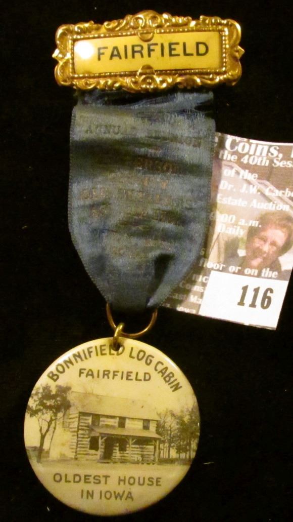 Badge with Ribbon and Hangar "Fairfield", "…Jefferson County Old Settlers…1916" (barely legible on ribbon", hangar "Bonnifield Log Cabin/Fairfield/Oldest House/In Iowa".
