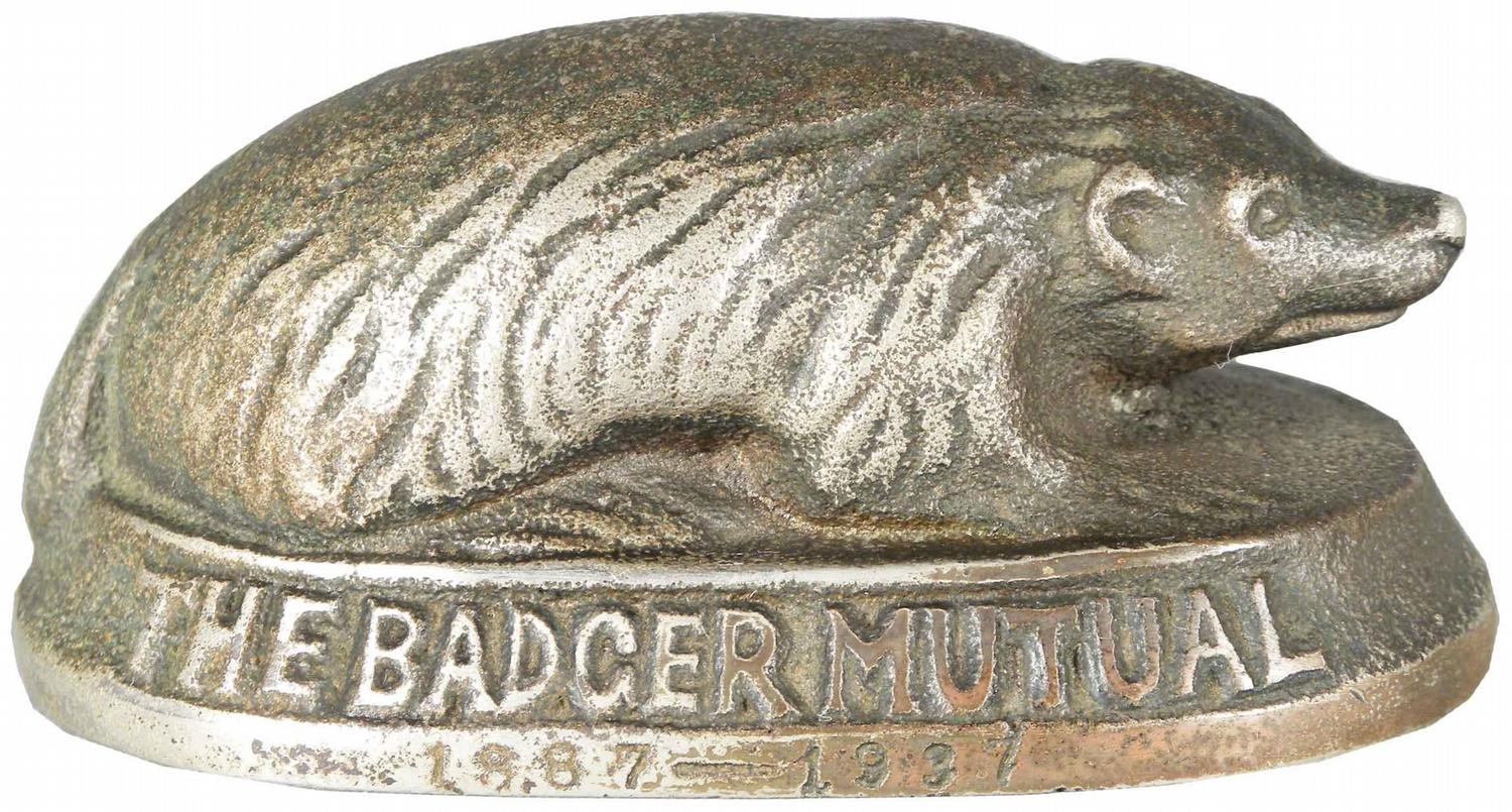 The Badger Mutual Fire Insurance Company Paper Weight. 100th Anniversary 1837-1937. Nickel plated cast iron. Most of the nickel worn off otherwise good condition. 3 3/4 inches long.