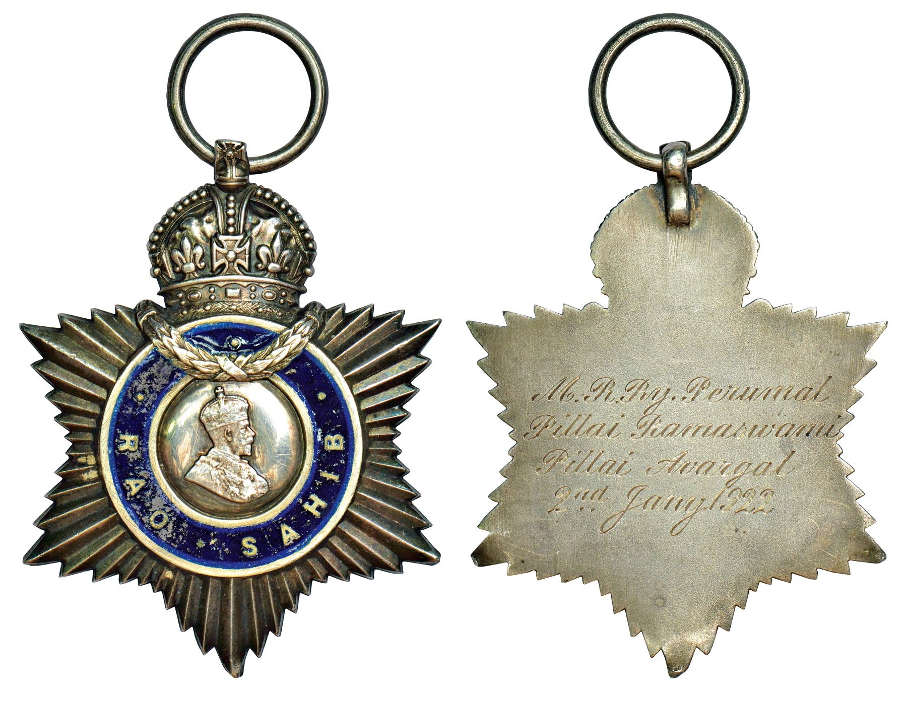 British India, Third Class, title badge, George V, silver, 39.16g, MYB 327. Obv: British crown with a laurel wreath below it left facing Portrait bust of George V in centre circle, outer circle engraved with title RAO SAHIB with deep blue enamel. Rev: Awarded to hand engraved M.R.RY Perumal Pillai Rama Swami Pillai Avargal 2nd Jany. 1922.