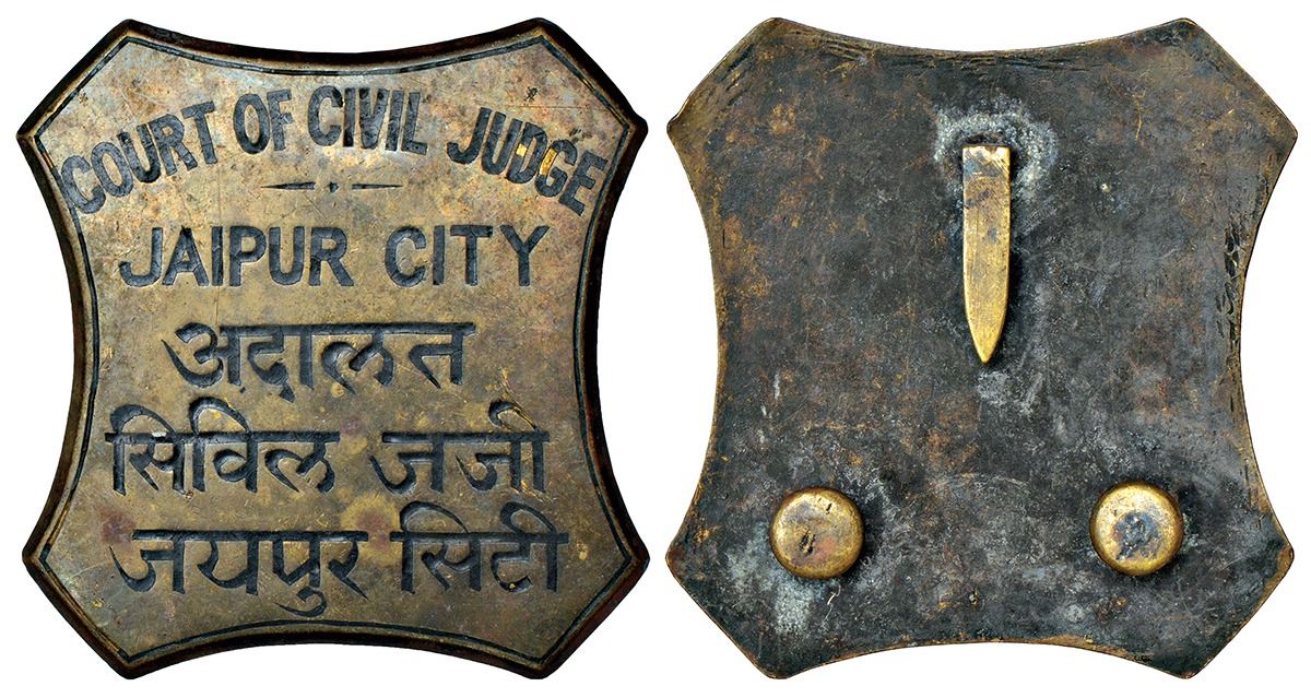 Jaipur State, Chapras badge, brass, undated, legend 'COURT OF CIVIL JUDGE JAIPUR CITY' in English and Devanagari, engraved in exergue, 233.2g.