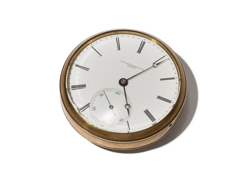 This pocket watch by Badollet was made in Switzerland around 1900. The watch is fitted with a key wind-up and displays hour, minute and small second. The white dial shows blued hands. The watch case is made of brass. The movement number is 86015. The watch has a glass bottom. Maker’s mark on dial and movement.