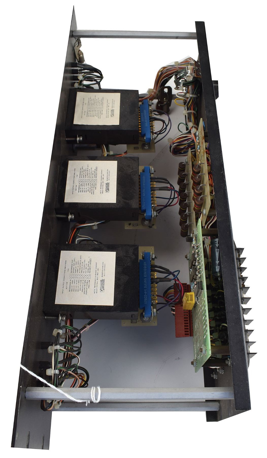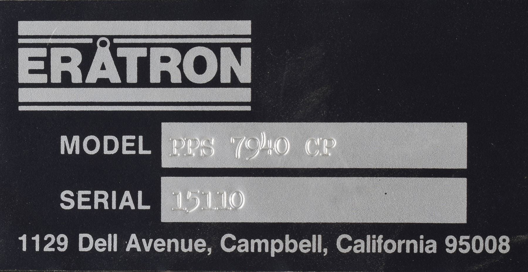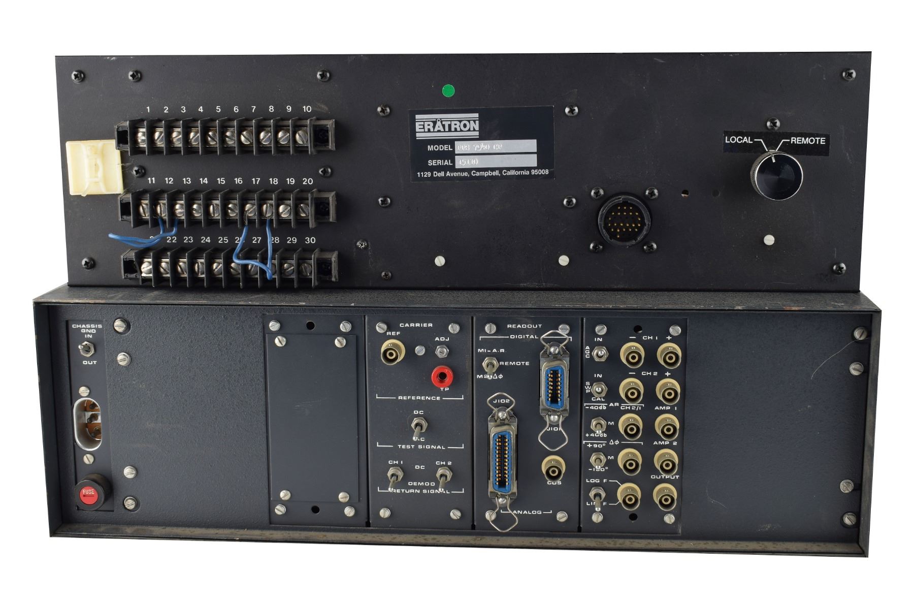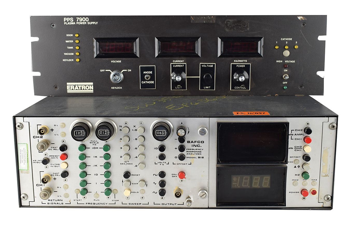 Two pieces of hardware: a Bafco Model 916 frequency response analyzer (which the consignor notes was used at the North American Rockwell plant in Downey, California, during the Apollo era), measuring 17? x 5.5? x 14.5?, featuring a multitude of colorful knobs and buttons on the front, with inputs and outputs on the rear; and an Eratron PPS 7900 plasma power supply panel, measuring 19? x 5.25? x 6.5?, with three knobs and digital readouts on the front. In overall very good to fine condition.
