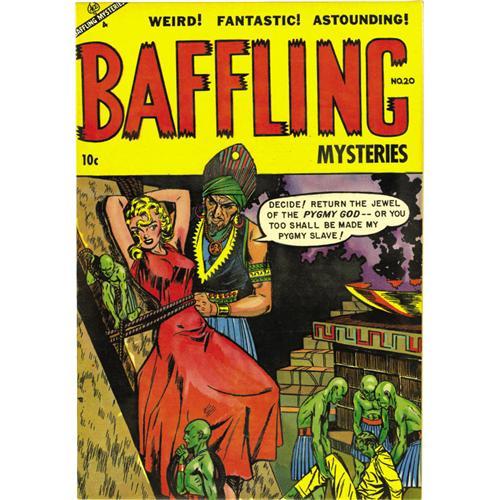 <B>Baffling Mysteries #20 File Copy (Ace, 1954) Condition: NM-.</B></I> Overstreet gave its "classic" designation to this bondage cover; what is it about the preponderance of pygmies in these pre-Code horror books? Inside, there's excellent art by Lou Cameron. Considering the highest-graded CGC copy as of this writing is a NM- 9.2, this copy, which has cream to off-white pages, is undoubtedly among the best available. Overstreet 2006 NM- 9.2 value = $360.<I>From the John McLaughlin Collection</B></I>. <BR><BR><B>Important notice:</B> Heritage usually auctions material at the rate of 200-250 lots per hour. On some occasions eBay Live bid software or the Internet may not be able to keep up with the pace of the auction. We recommend placing a realistic absentee bid now as insurance to avoid disappointment. Occasionally the auctioneer may eliminate or reject an eBay Live bid, and the auctioneer may also reopen a lot after the close of the eBay live bidding (usually because we missed an audience bid), and may reject your bid even if it shows you as the winning bidder. By bidding via eBay Live, you agree that Heritage may award the lot to another bidder at its sole discretion under the circumstances described above or any other reasonable circumstances. Since eBay bids are not shown to us until we open the lot on the floor, we treat those bids just like floor bids. In most cases the floor responds before the eBay bid is presented to us, due to Internet lag time, so for consistency we have made it a policy that floor bids are always considered first over tie eBay live bids. Also please note that all Heritage lots purchased through eBay Live carry a 22.5% Buyer's Premium. Please make sure you read the Terms and Conditions before you bid. This lot is being auctioned in conjunction with a live floor auction by Heritage Auction Galleries. All final auction and invoice information will be supplied by Heritage Auction Galleries, and all other information should be considered preliminary. Lot:50057 <BR><BR><B>Winning Notification and Billing:</B> After the FINAL session in this auction is complete, Heritage will send e-mail and snail mail invoices. This process normally takes several days. All final auction and invoice information will be supplied by Heritage Auction Galleries, and all other information should be considered preliminary. <BR><BR>This auction will be conducted on a live auction floor and over the Internet through eBay Live. If you choose to place an absentee bid, please take a moment to <font color='#0000ff'><u><a href='http://pages.ebay.com/liveauctions/help/before/laabsentee.html'>learn how eBay Live absentee bidding works</a></u></font><font color='#000000'>