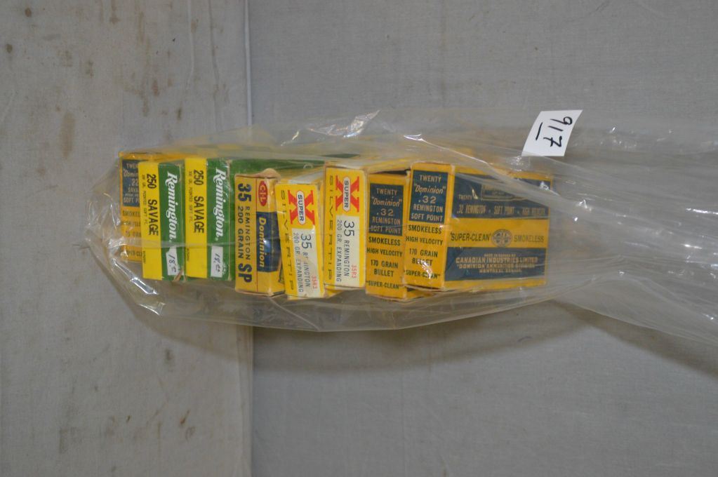 Bag Lot ; 1 Box Dominion, 2 Boxes Remington .250 Savage cal ammo - 1 Box Dominion, 2 Boxes Western Super X .35 Rem cal ammo - 2 Boxes Dominion .32 Rem cal ammo