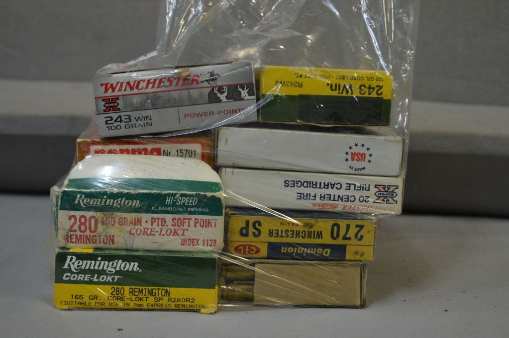 Bag Lot : 2 Boxes ( 20 rnds per ) .223 Rem Cal Ammo - 30 Plus Rnds 5.56 Ball Ammo - 1 Box ( 20 rnds ) .220 Swift Cal Ammo - 1 Box ( 20 rnds ) .270 Win Cal Ammo - 59 Rnds .280 Rem Cal Ammo - 10 Rnds .243 Cal Ammo [ possibly some reloads ]
