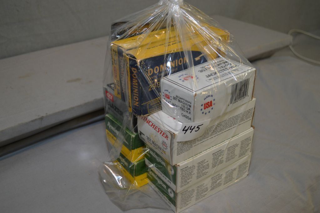 Bag Lot : 2 Boxes ( 50 rds per ) Remington .357 Mag 125 Grain JSP Cartridges - 2 Boxes ( 50 rnds per ) Remington .357 Mag 158 Grain JHP Cartridges - 1 Box ( 50 rnds per ) Winchester .357 Mag 110 Grain JHP Cartridges - 1 Box ( 50 rnds per ) Olin Made in USA .357 Mag 110 Grain FHP Cartridges - 1 Box ( 40 rnds per ) CC1 Blazer 158 JHP Aluminum Cases non-reloading unique production method - .219 Zipper Cartridges hand loaded from 25 - 35 Winchester Brass Approx. 50 count in metal box