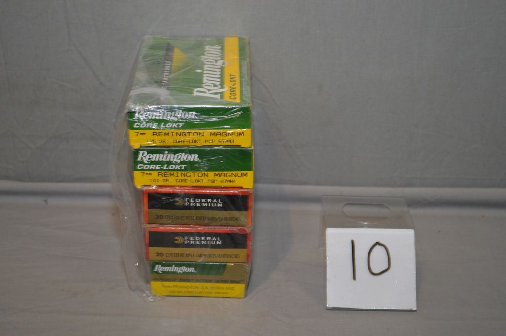 Bag Lot : 5 Boxes ( 20 rnds per ) Ammo : 2 Boxes Rem .7 MM Rem Mag ( one 175 grain & one 140 grain) - 2 Boxes Federal Premium .7 MM Mag ( one box 140 grain, one box 160 grain) - 1 Box Rem Premier Short Action Ultra Mag .7 MM Rem SA Ultra Mag 150 Grain