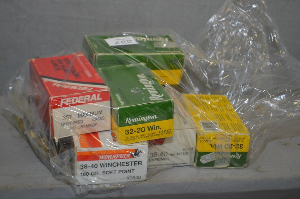 Bag Lot : Ammo : 12 Rnds .44 Russian Reloads - Bag : approx. 12 rnds various cal collector cartridges - Box ( 44 rnds ) .38 - 40 Win Cal ammo - small bag : 22 Rem ? Cal ammo - Box .38 - 40 Unprimed Brass - Box 35 .357 Mag Unprimed Brass - Approx. 26 rnds plus 3 boxes of brass .32 -20 Cal -