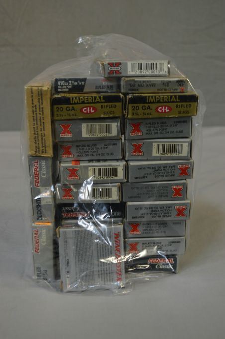 Bag Lot : Approx Twenty Boxes .20 Ga Slugs & 0 Buck 2 3/4" & 3" - Approx. 4 Boxes ( 5 rnds ) .410 Ga Shot Shells - 1 Box Peters .16 Ga Shot Shells