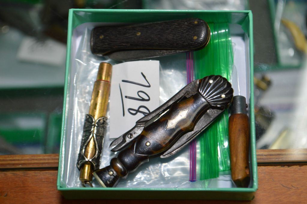 Bag Lot : Four Antique Items : one small knife w/drop blade brass & silver plated " Hall of Science, Century of Progress, Chicago 1933 - small # 2 Opinel folding knife - Two Pipe Smoking Knives w/tampers [ ornate carved handle w/scissors, multi blades no name visible - dark wood handle w/2 blades & tamper, stpd Foreign ]