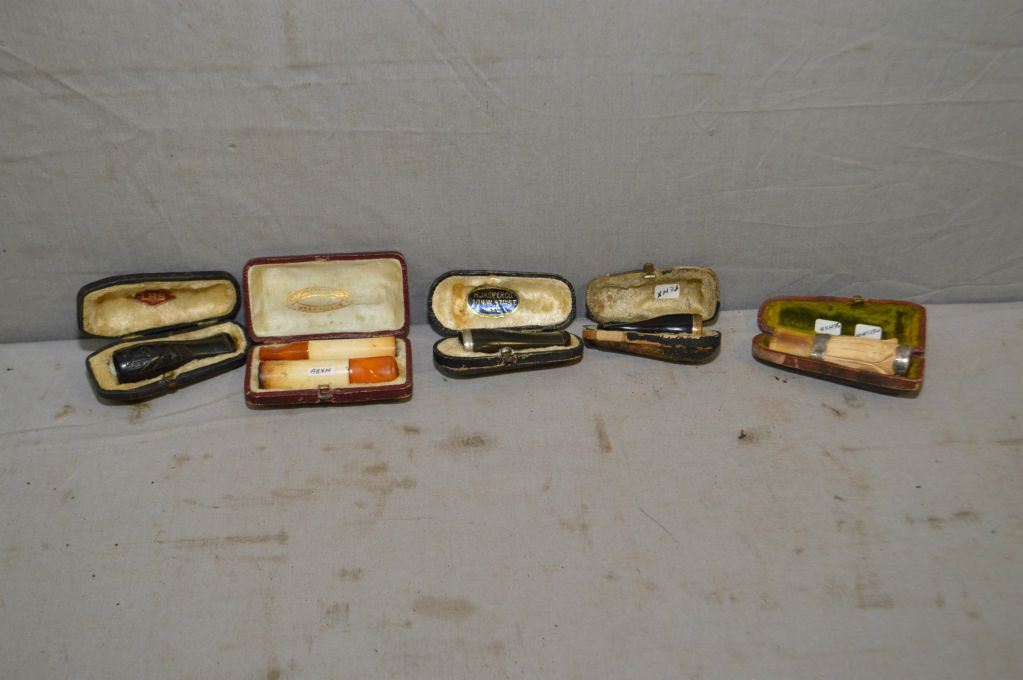 Bag Lot : Four Single Antique Cigar Holders & One Double w/cases: [ Silver double rings Hall Marked B.W. Silver Meershaum - engraved ebony ? case mkd LHS in Diamond - The Fitall by C.P.F in Oval case mkd H.Jasper Co. 404 West 92 St. N.Y.C. - brass tipped ? case marked W.D.C. Triangle Genuine Bakelite - double tips case mkd Gauranteed ECHT Meershaum ]