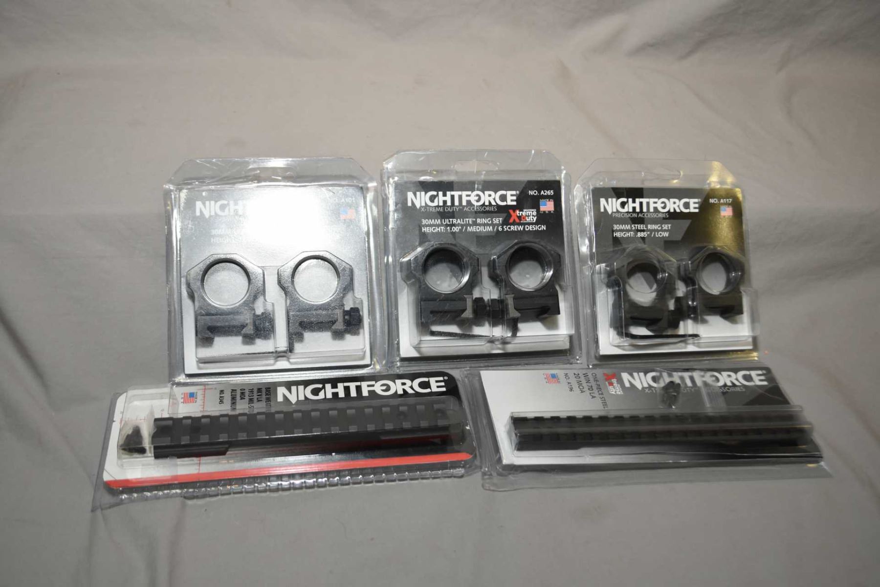 Bag Lot : Nightforce Rings & Bases [ as new in pkgs ] : (1) 30 mm Steel Ring Set Low - (1 ) 30 mm Extreme Duty Ultralight 6 Screw Medium - ( 1 ) 30 mm Extreme Duty Ultralight 4 Screw Medium - ( 1 ) OMOA 1 Piece Aluminum Base Weatherby MK V LA - ( 1 ) 20 MOA 1 Piece Steel Base Win M70 LA