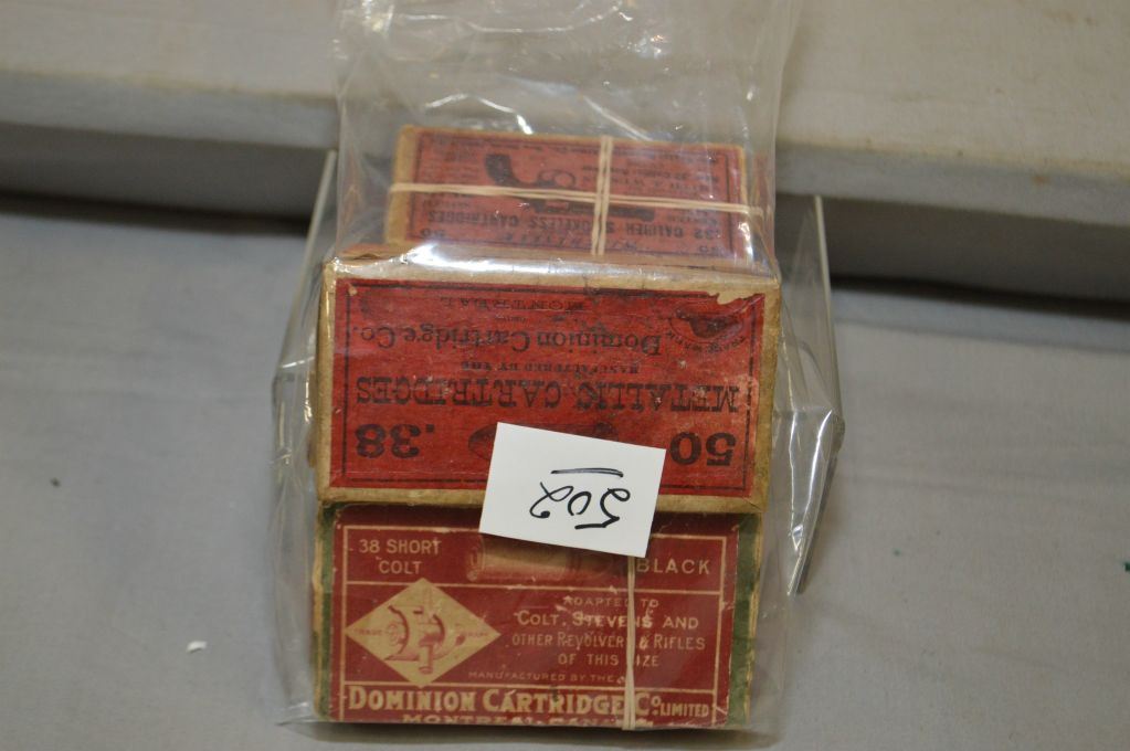 Bag Lot : One Two Piece Box Dominion Cartridge Co. .38 Short Colt Cal Black Powder Center Fire Cartridges ( 50 rnds ) - One Two Piece Box Dominion ( 35 plus rnds ) .38 Short Rimfire Cartridges - One Two Piece Box Winchester ( 50 rnds ) .32 S & W Cartridges