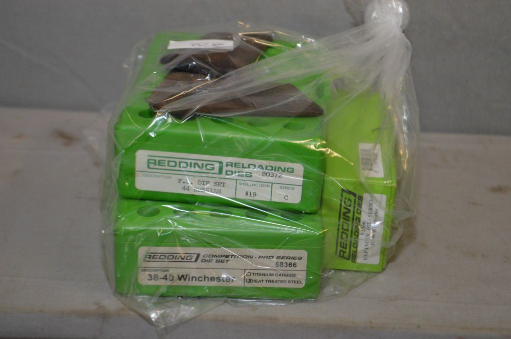 Bag Lot : Redding .38 - 40 Win Cal Heated Treated Three Die Set - Redding .44 Russian Three Die Set - Redding .38 - 40 Expander Die - Wooden Grips for Bicycle Rifle ? ( one is cracked )