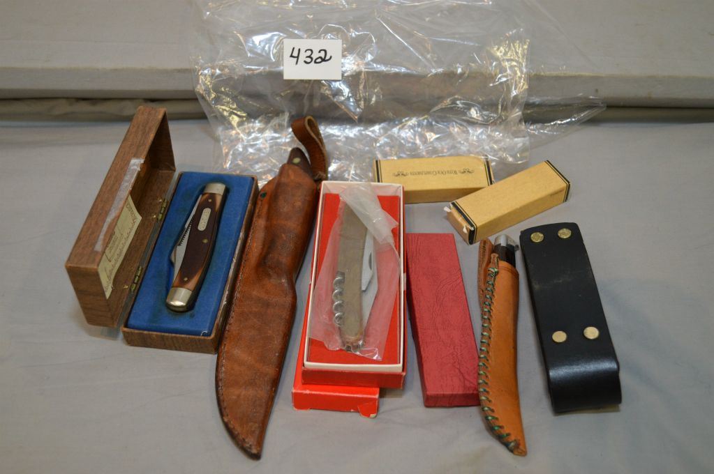 Bag Lot : Spyderco Police Model Serrated Edge Locking Knife [ clip model, new in box ] - Leatherman Super Tool in leather case [ new ] - ( 2) Multi Purpose Folding Knives "Husky Presentation Gift" [ new ] - Small Sheath Knife [ Made in Denmark, New ] - Russell Original Canadian Belt Knife w/ sheath - Indiana Pocket Knife [ new in box ] - Old Timer Pocket Knife [ new in box ] - Premier Folding Knife [ new in box ]
