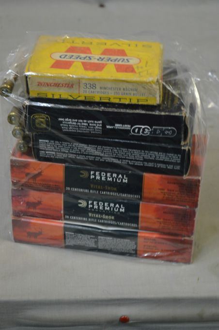 Bag Lot : Three Boxes ( 20 rnds per ) Federal .338 Win Mag Cal Ammo - 1 Box Plus 17 Rnds Winchester Black Talon .338 Win Mag ammo - 24 Rnds Various .338 Win Mag Ammo