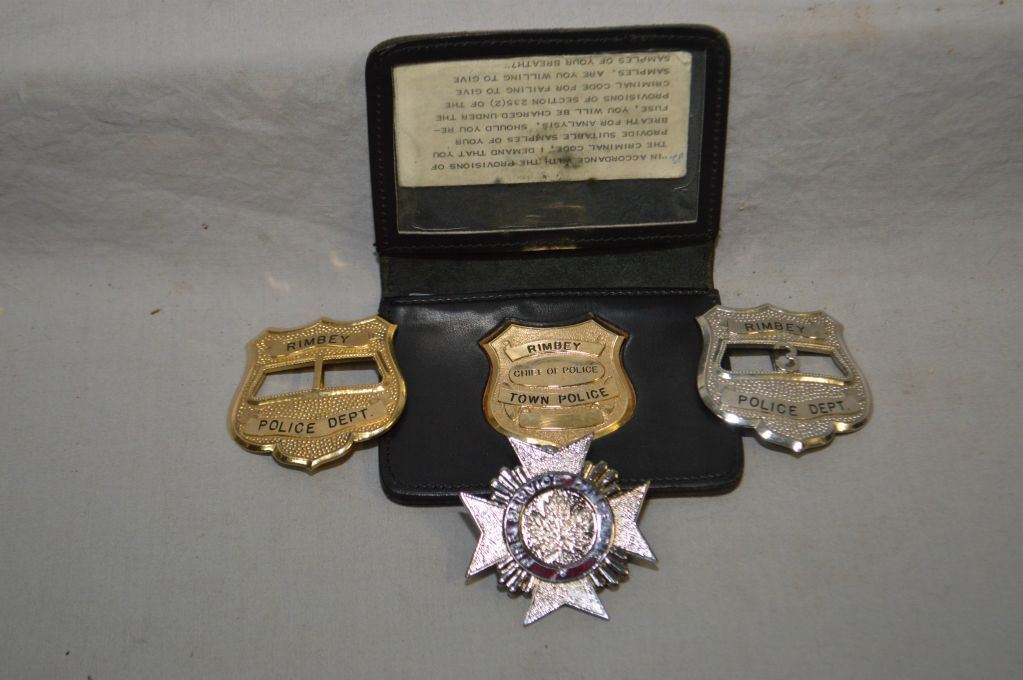Bag Lot : Three Police & One Fire Service Badges [ Rimbey Chief of Police Town Police w/leather case - Gold Toned Rimbey Police Dept. No. 1 - Silver Toned Rimbey No. 3 Police Dept. - Silver Toned Fire Service