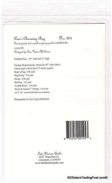 Pattern is for 'Pam's Charming Bag' #304 designed by Pam Vieira-McGinnis for Late Bloomer Quilts. SRP $7.99