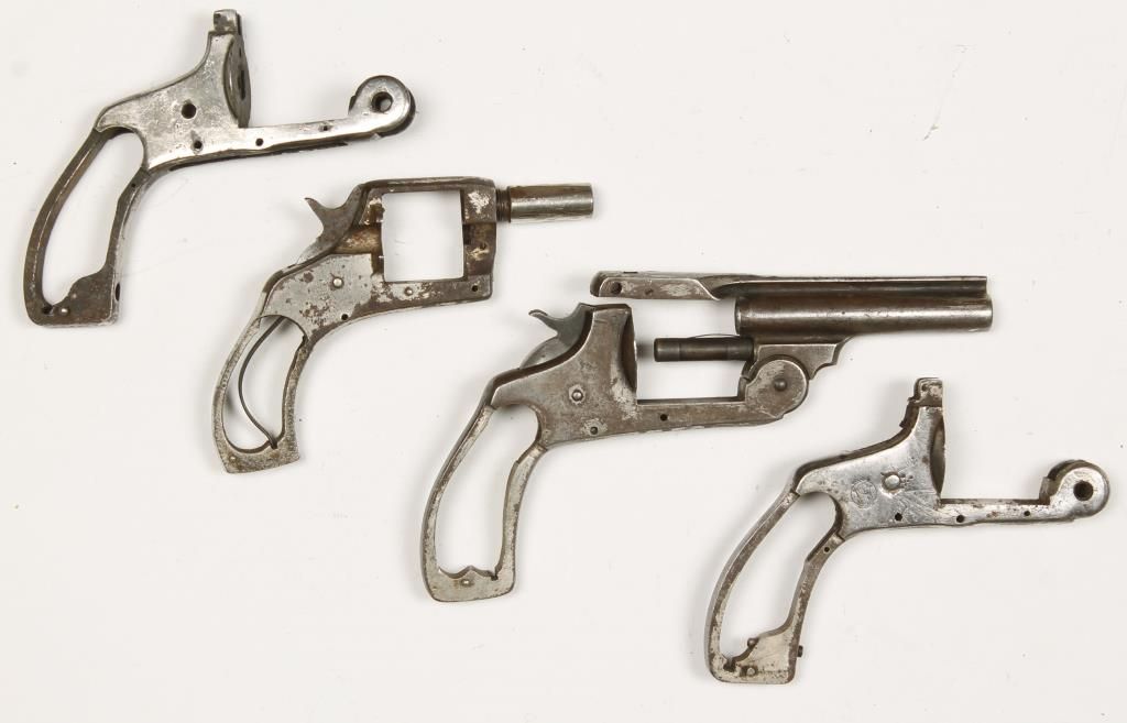 3 top-break frames and 1 solid frame. One top-break frame has the barrel attached and is an Iver Johnson