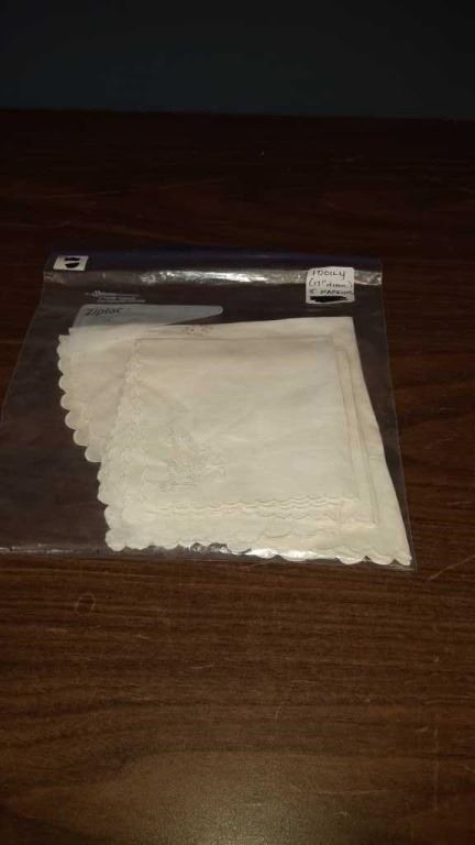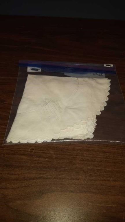 Bag with vintage Linens one doily 7 inch diameter and five napkins