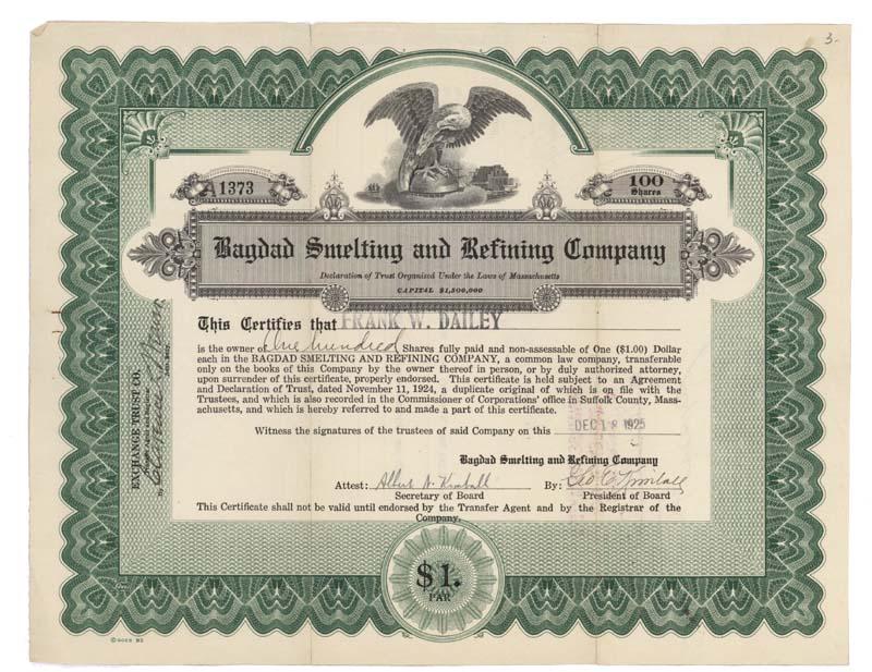 1925, Massachusetts. Stock certficate for 100 shares. Green/Black. Vignette at top center of eagle with spread wings. Uncancelled. Fine.