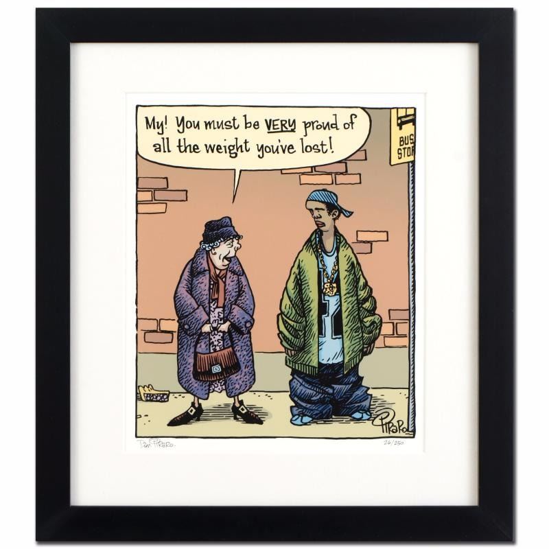 Enter a surreal and satirical world of twisted imagination and award winning creativity. "Baggy Pants" is a limited edition giclee on paper by Dan Piraro, creator of the critically acclaimed and award winning comic strip, Bizarro! This piece is framed, numbered and hand signed by the artist! Includes Certificate of Authenticity! Measures approx. 17" x 19" (with frame), 9.5" x 11.5" (image).