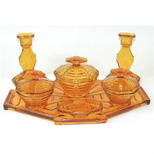 This stunning 10 piece Art Deco Vanity Set was produced by the Bagley Glassworks circa 1930s, in their Cobweb pattern. The set consists of an octagonal vanity tray - matching trinket tray - 2 candlesticks - one large powder jar with lid - and two smaller powder jars with lids. The tray is has dimensions of 13 x 8 inches and features an Art Deco geometric pattern of triangles. The Cobweb motif runs the candlesticks, the jars and lids. Each candlestick stands 5 1/4 inches tall and has a flared octagonal foot with a 3 3/4 inch diameter. The octagonal design is also found on the jars, where the larger has a 4 inch diameter x 3 1/2 inches tall and the two smaller ones have a 3 inch diameter x 3 1/4 inches tall. More photos are available by request. This is a very special Bagley Glass complete 10 piece dresser set that includes the rare miniature trinket tray. All 10 pieces are in excellent condition without any damage