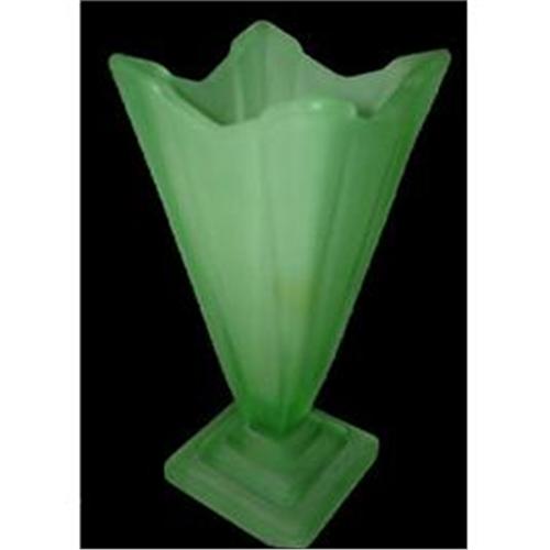 Produced by Bagley Glassworks in their Wyndham pattern the 1930s from Green Satin or frosted Depression era glass that fluresces under black light. Measuring 8 inches tall x 4 1/2 inches across the base and is in excellent condition