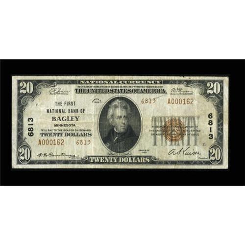 <B>Bagley, MN</B></I> - $20 1929 Ty. 2 <B>The First NB</B></I> Ch. # 6813<BR> This piece first appeared at auction in 1998. The paper is pleasing and original with signatures of G.B. Courtney and A. Kaiser. <B>Fine-Very Fine.</B></I><BR><BR><b>Shipping:</b> Coins & Currency (<a target="_blank" href="http://www.heritageauctions.com/common/shipping.php">view shipping information</a>)