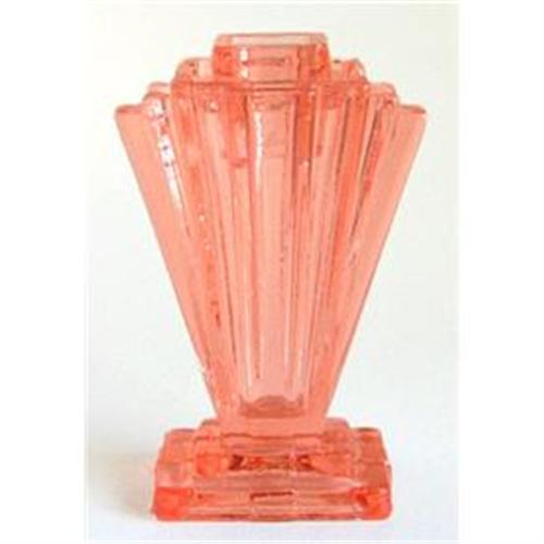 This lovely pink Depression glass Grantham vase was produced by Bagley Glassworks of Knottingley, England, Pat No. 334, circa 1930. Featuring a stunning Odeon Art Deco geometric shape and stepped base. Complete with its flower holder it stands 4 1/4" tall this excellent example of British Depression Glass is, with the exception of a few tiny nibbles on the flower holder, in excellent condition.
