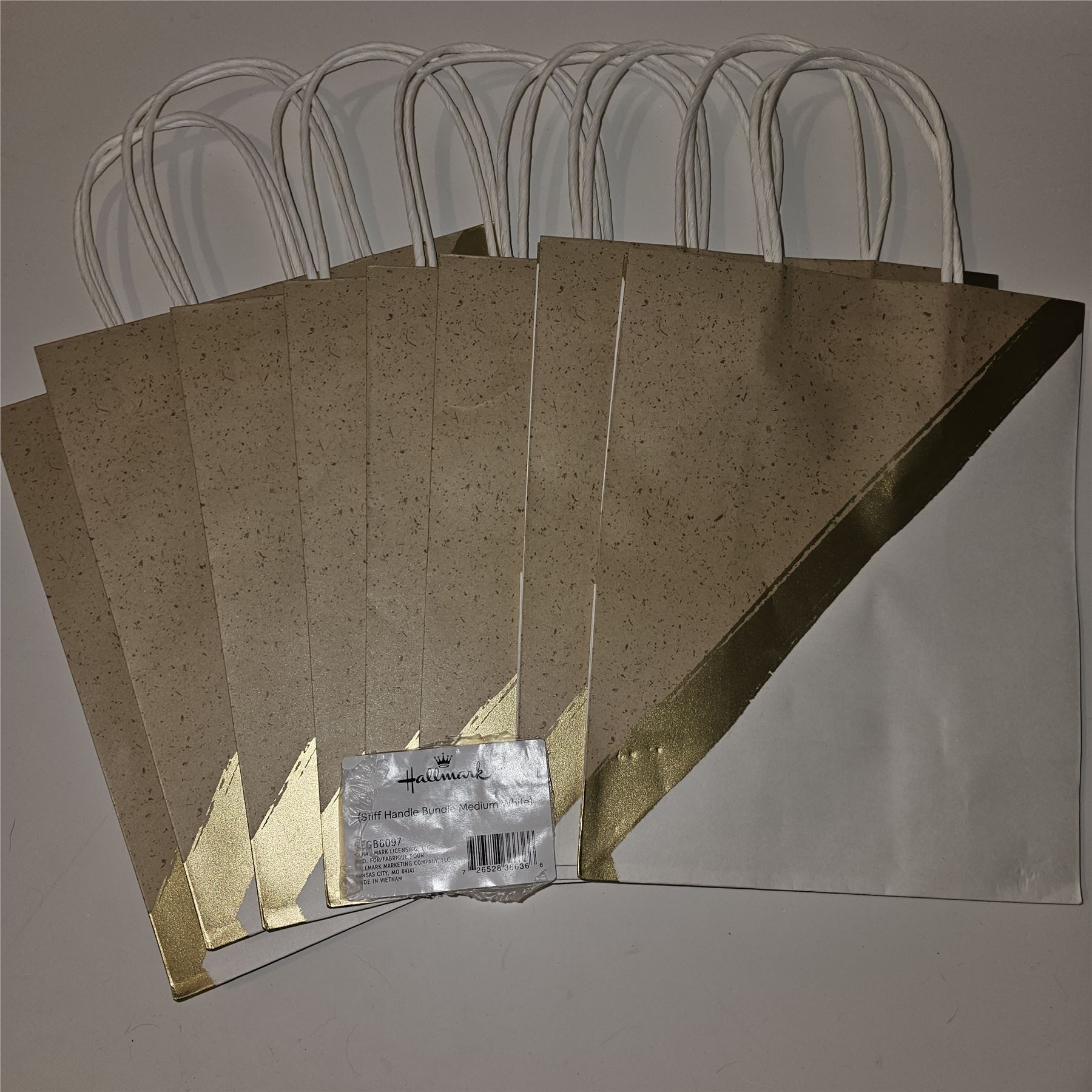 Set of medium-sized kraft paper bags with gold foil accents, includes white handles, new with tags.