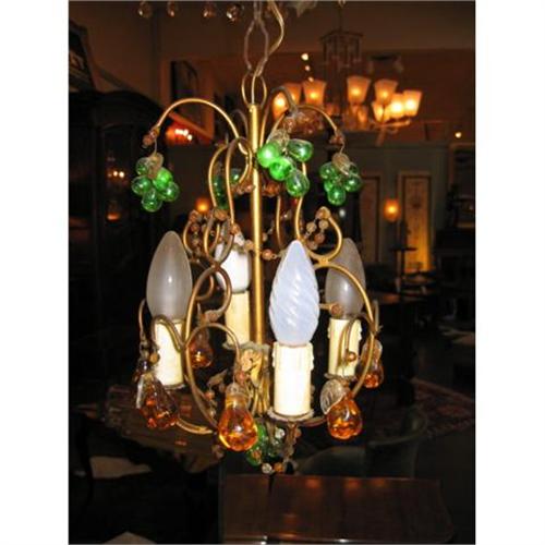 Darling Bagues style colored glass and gilded brass chandelier with fruit shape pendants (grapes and pears), from Nice.