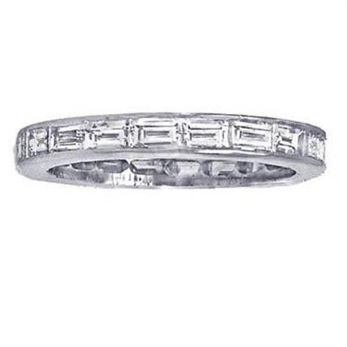 Elegant platinum and diamond eternity band set with baguettes cut diamonds. Diamonds are H color, VS clarity and have a total approximate weight of 1.80ct. Small surcharge for sizes over 7.5. 10% restocking fee for returns of sizes under 5 and over 7.