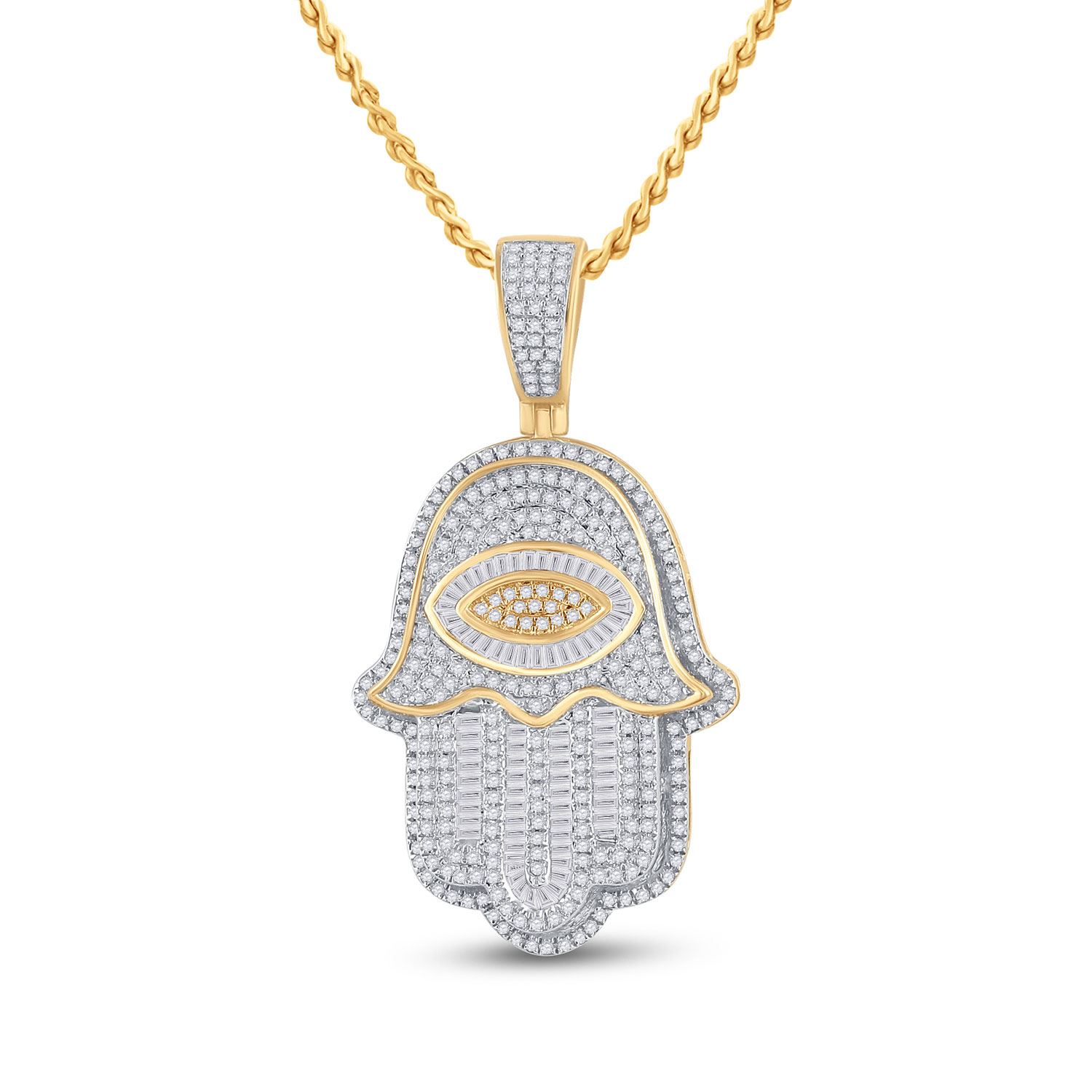 14kt Yellow Gold Mens Baguette Diamond Eye Fatima Hamsa Charm Pendant 1-1/2 Cttw.