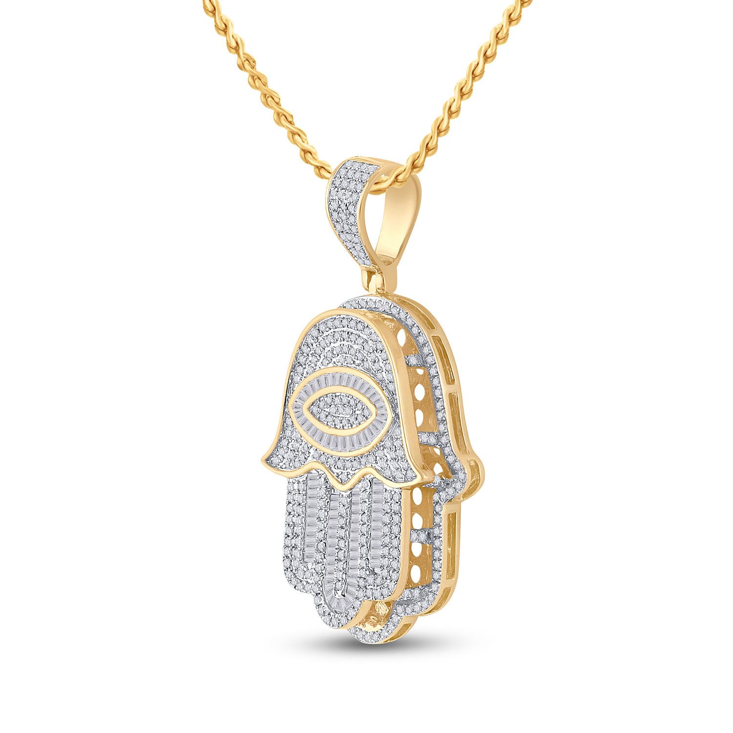 Baguette Diamond Eye Fatima Hamsa Charm Pendant 1-1/2 Cttw 14KT Yellow Gold