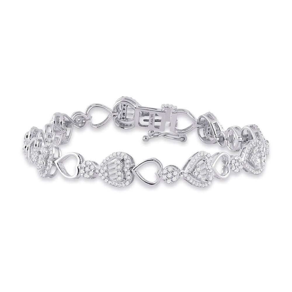14kt White Gold Womens Baguette Diamond Heart Link Bracelet 2 Cttw