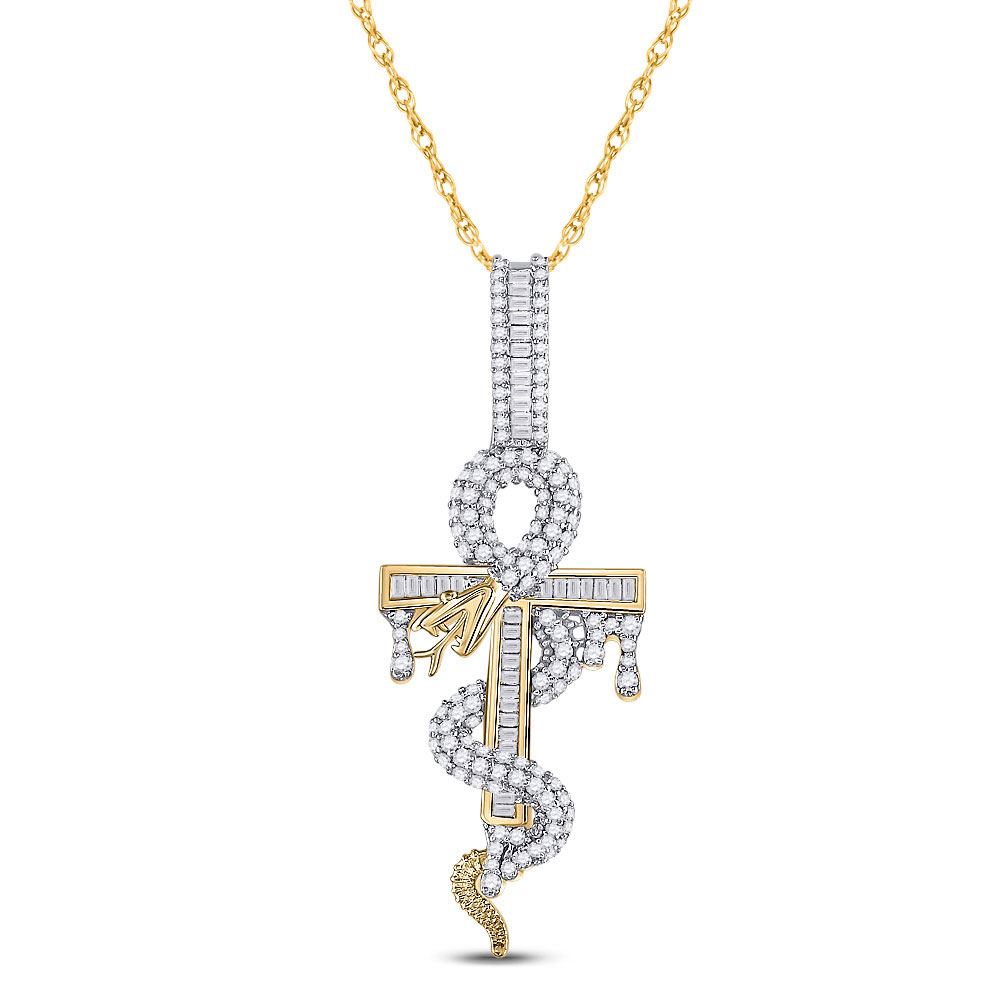 10kt Yellow Gold Mens Baguette Diamond Snake Ankh Cross Charm Pendant 1-1/5 Cttw.