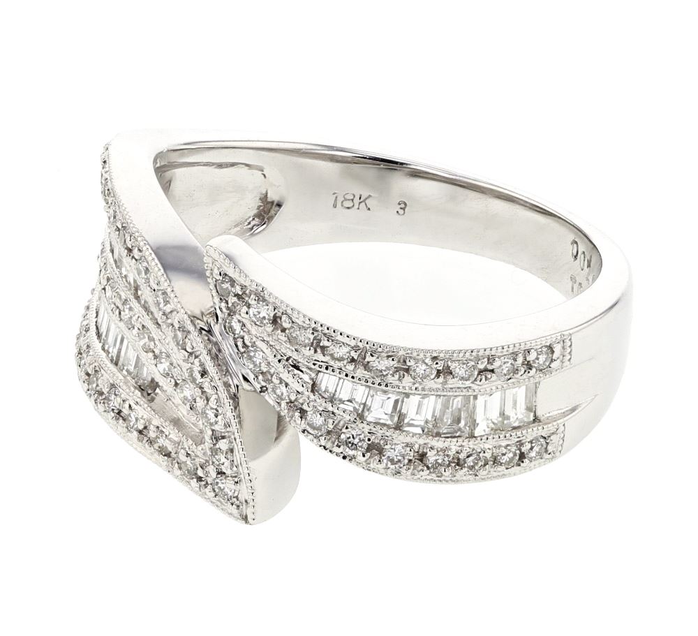 Baguette & Round Bypass Shank Diamond Ring in 18K White Gold
