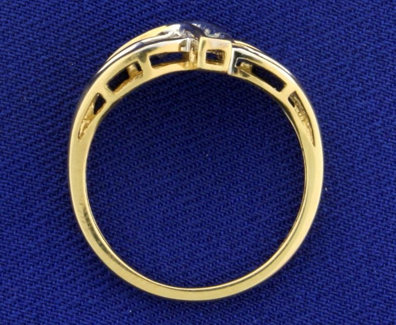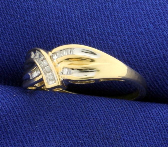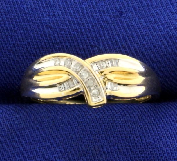 In 10k yellow and white gold. Containing six round .01ct diamonds and eleven .01ct baguette diamonds, all high quality SI clarity/G color. Size 7 1/4. 2.3g.