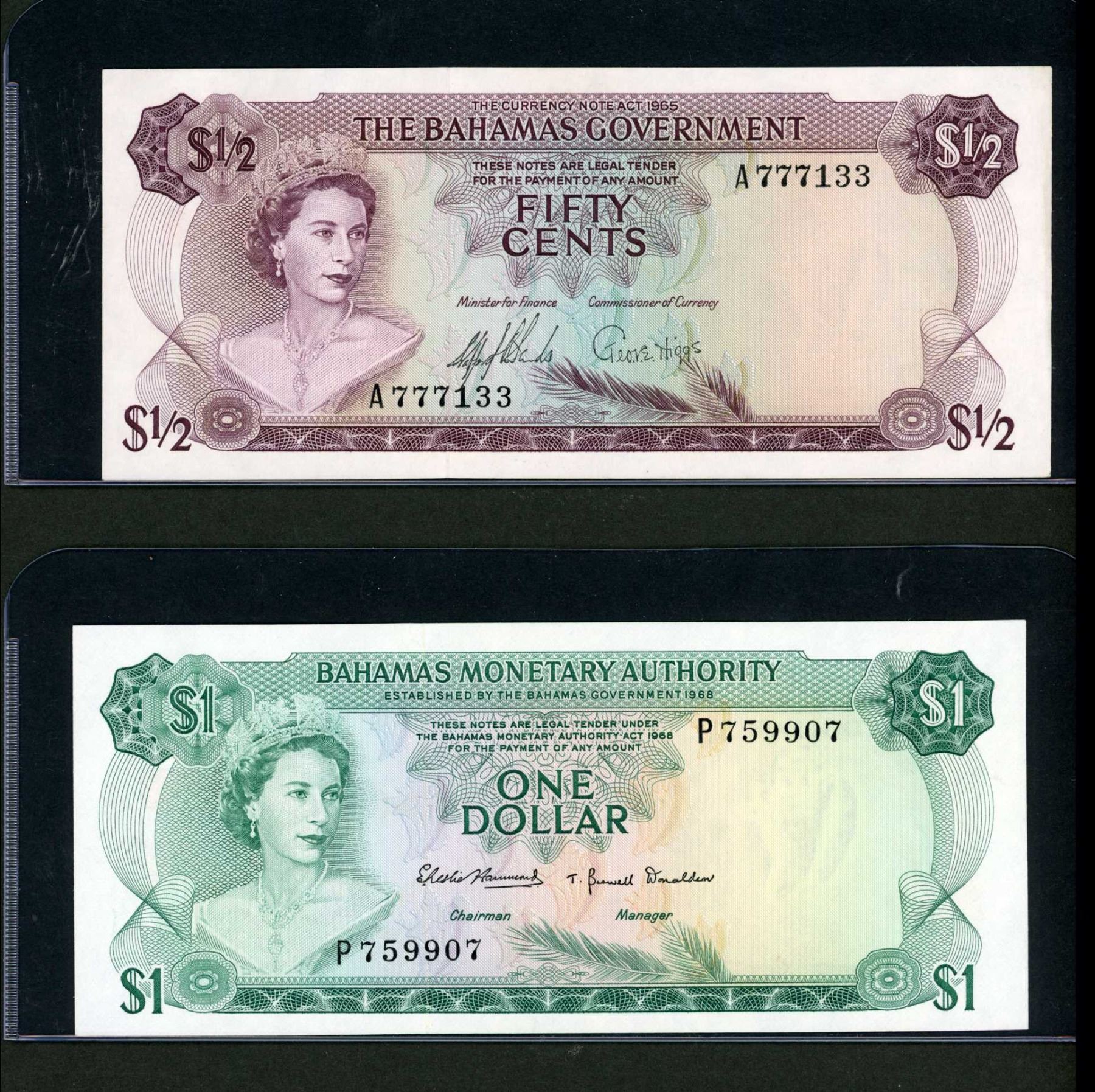 1 x 1965 1/2 dollar P-17a S/N A777133 AU, 1 x 1968 $1.00 P-27a S/N P759907 UNC, 1 x 1968 $3.00 P-28a S/N B458218 EF and 1 x 1974 P-37a $5.00 S/N H343960 VF.