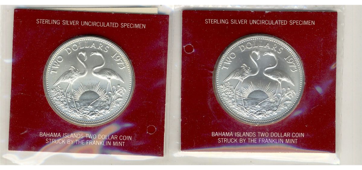 Bahamas 1973 Proof Sterling Silver UNC Specimen $2 Flamingo coin. Lot of 2 examples both in original casing. (1,7724oz)