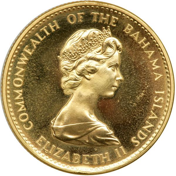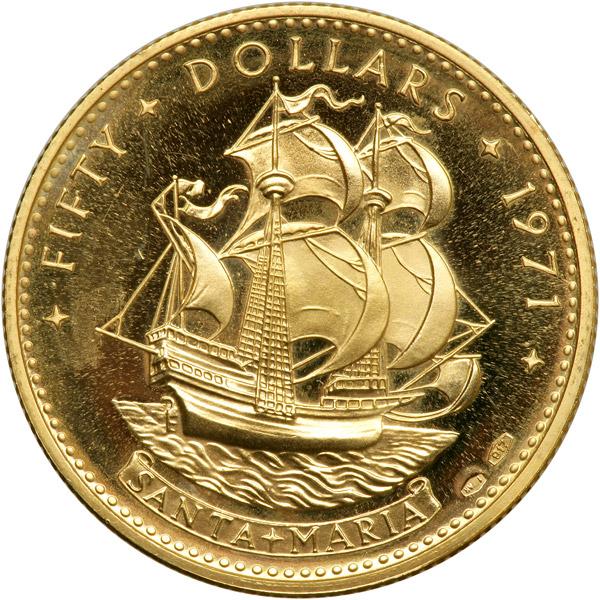 Bahamas. 50 Dollars, 1971. Fr-7; KM-29. Weight 0.5888 ounce. Elizabeth II. Reverse: Santa Maria sailing ship. Brilliant Uncirculated.