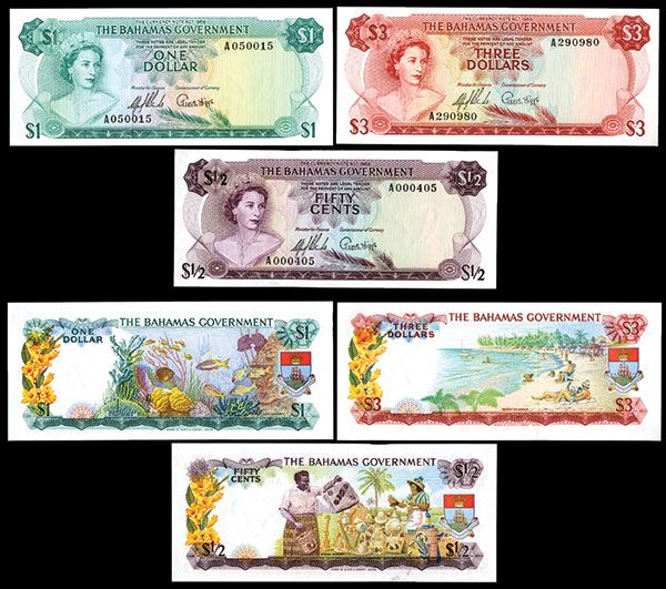 Lot of 3 notes, All are 1965 Issues with only two signatures. Includes 50 cents, P-17a with low S/N A 000405 in Choice AU; $5, P-18a in Choice + to Gem condition; and $3, P-19a, with S/N A 290980 in Gem Uncirculated. This last note is also the Pick Plate note in the SCWPM.
