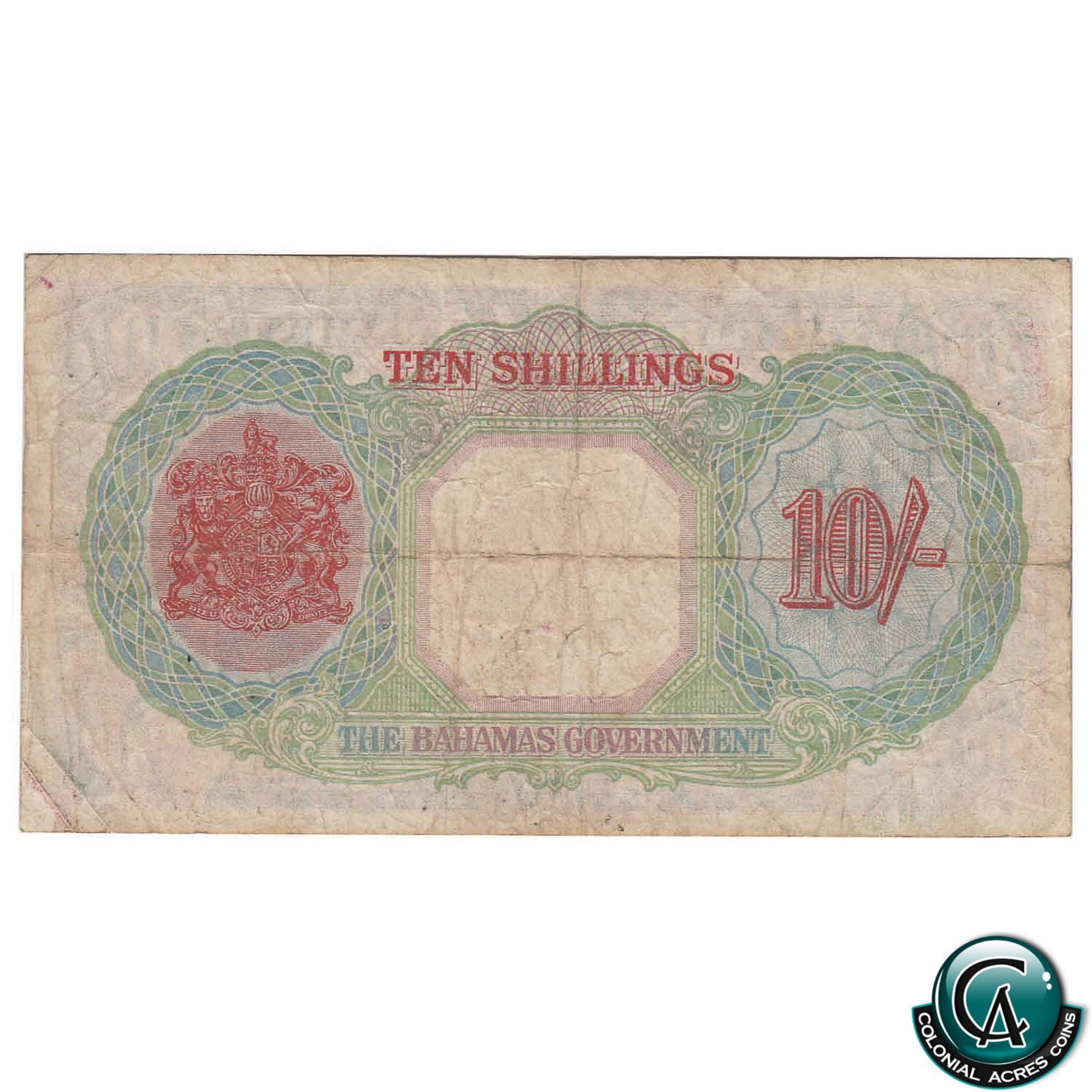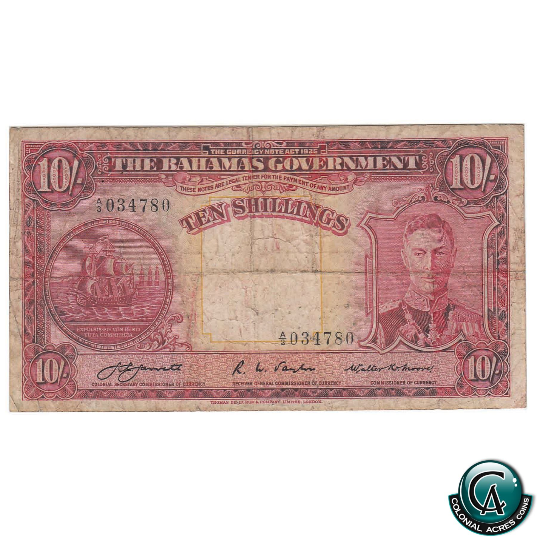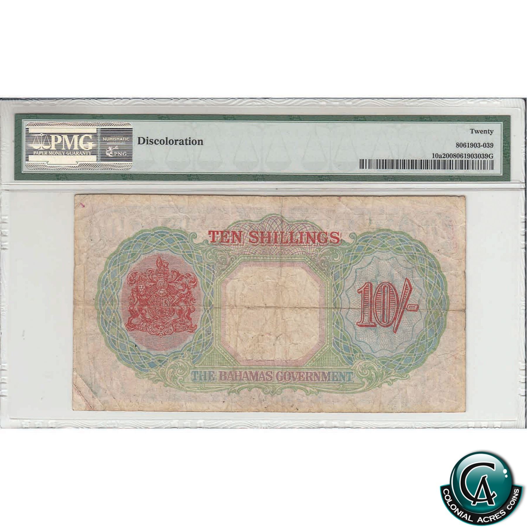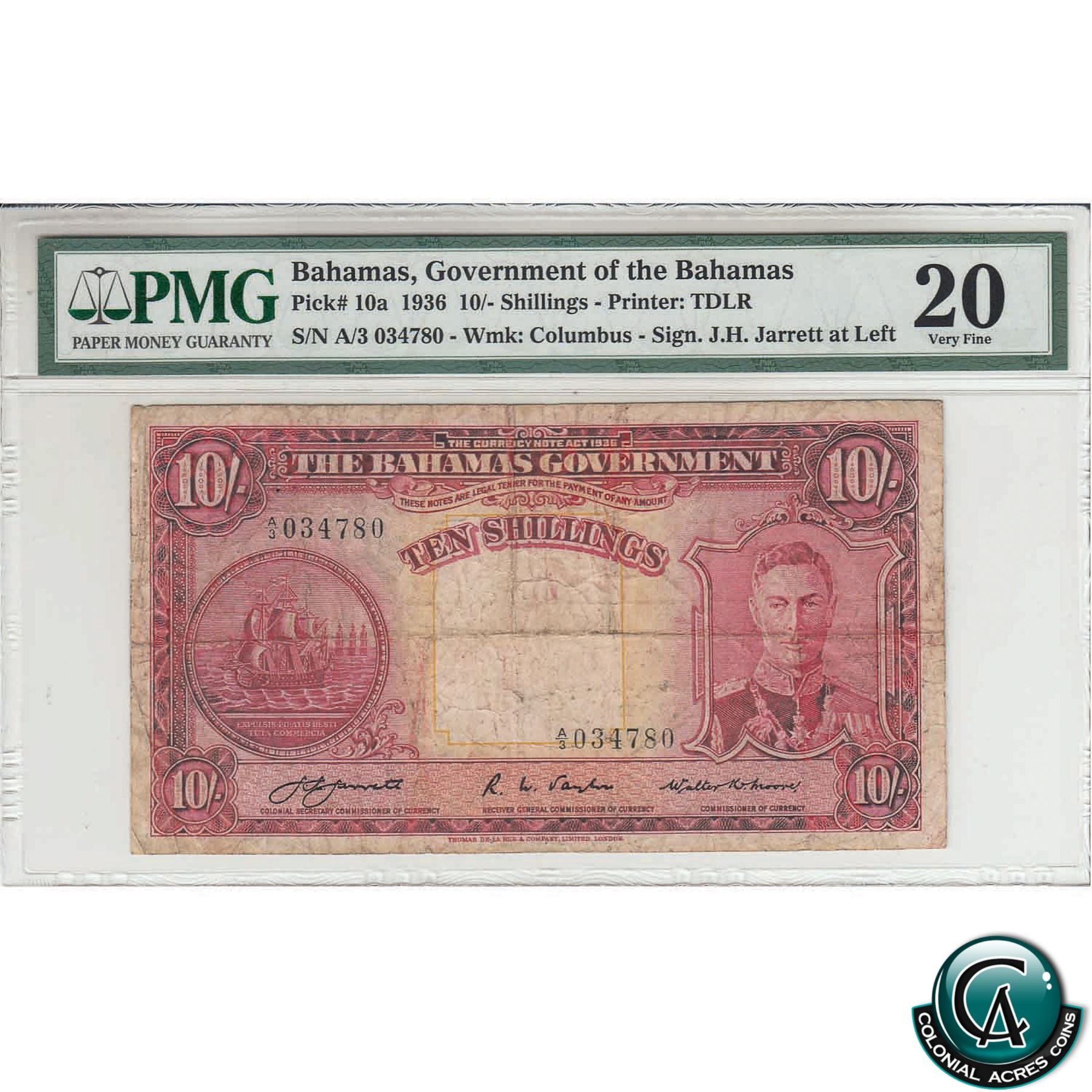 Bahamas Pick# 10a. 1936 The Bahama's Government 10/ Shillings, J.H. Jarrett at left, Columbus Watermark. S/N: A/3 034780. PMG Certified VF-20. *Scarce Note*
