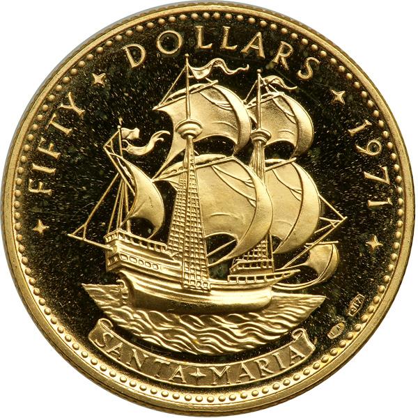 Bahamas. Proof Set: 100, 50, 20 and 10 Dollars, 1971. KM-PS5 (KM-26,28,30,32.1). Total weight 2.1196 ounces. Hallmark and fineness at bottom right. National arms, The Santa Maria, Lighthouse and Fortress on the four coins. In original case of issue. Lot of 4 coins. Brilliant Proof.