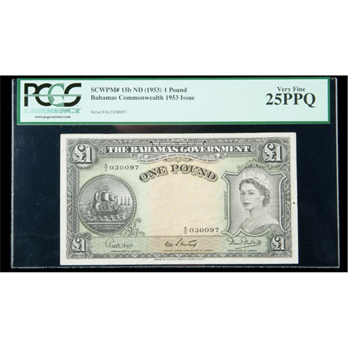 Bahamas SCWPM# 15b, ND (1953) 1 Pound. PCGS Very Fine 25PPQ. . Fr-15b. A second example, fresh and original with great colors and eye appeal for the grade.