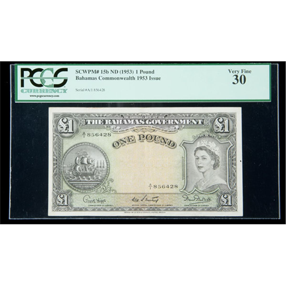 Bahamas SCWPM# 15b, ND (1953) 1 Pound. PCGS Very Fine 30. . Fr-P-15b. This is a lovely example of a scarcer note that is very difficult to locate any finer.