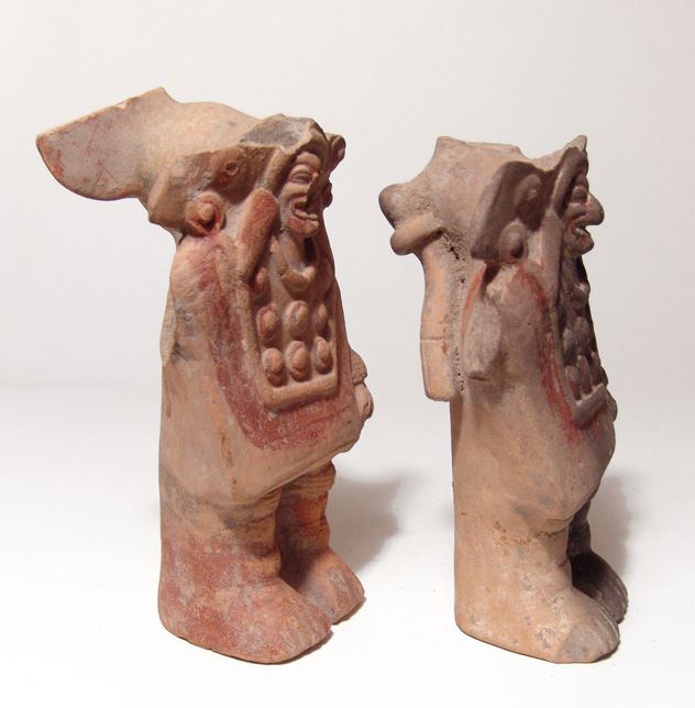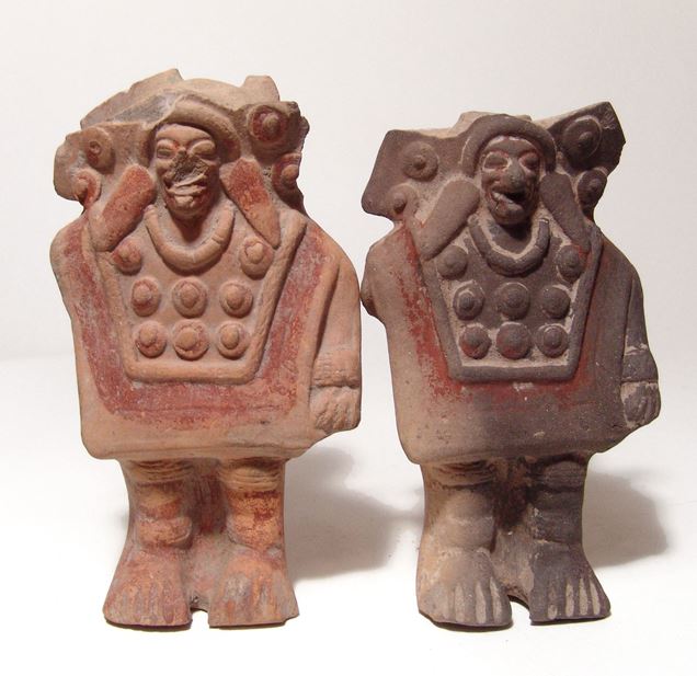 A pair of Bahia ceramic whistle figures from the same mold, Ecuador, c. 500 BC - AD 500, each wearing and elaborate costume showing good detail and remnants of red pigment. H: 4 3/4 in & 51/4 in. Both with losses to headdress and light deposits. Ex Dr. John Hilsabeck estate, Orange County.